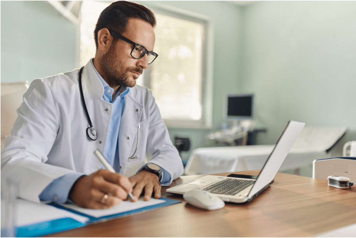 A male doctor wearing glasses and a white coat sitting at a desk and writing on a clipboard with a pen. There is a laptop, a computer mouse, and medical equipment in the background in a medical office.